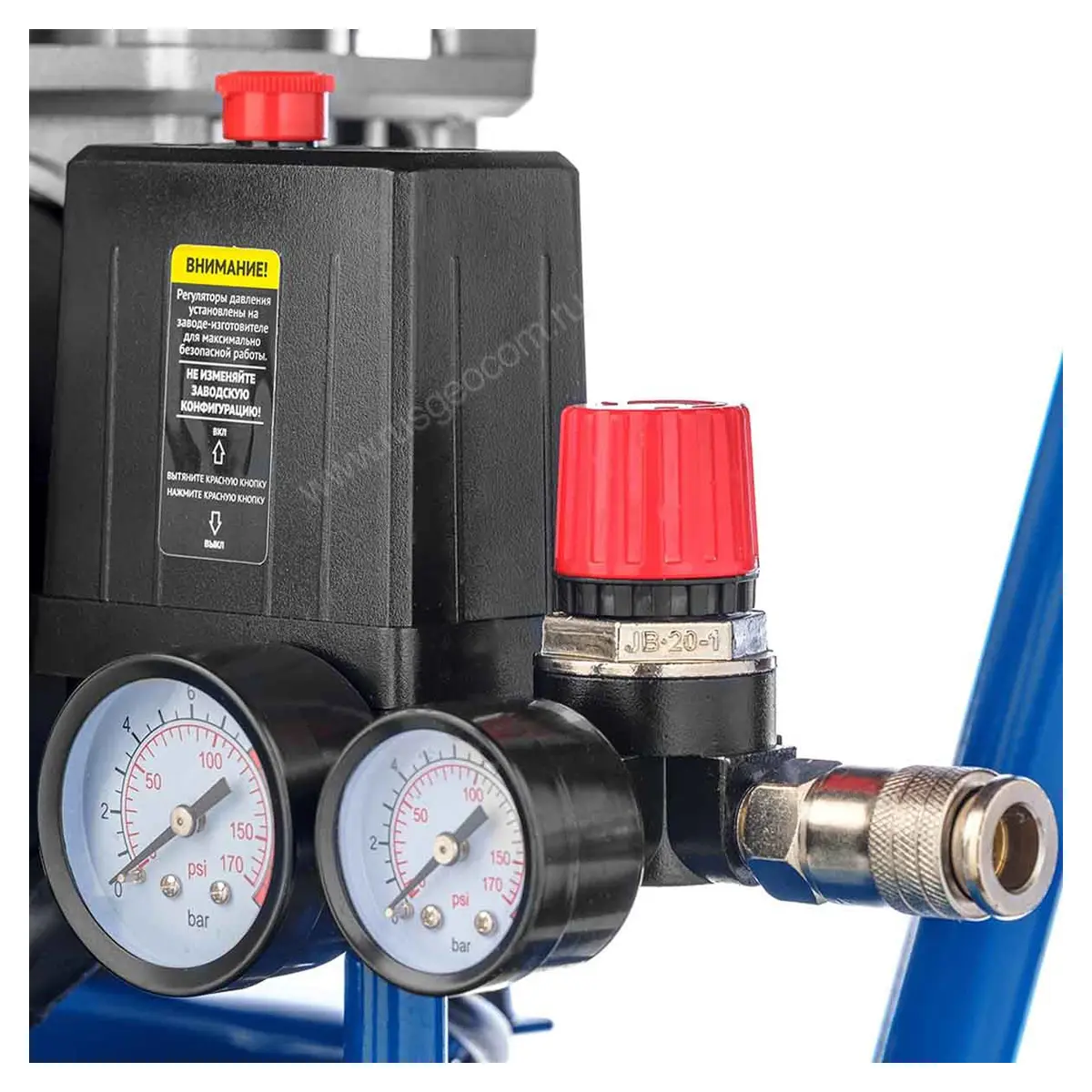 50-литровый ресивер обеспечивает накопление запаса воздуха, позволяя реализовать повторно-циклический режим работы, а также способствует сглаживанию пульсаций напора в выходной магистрали. Привод компрессора Hyundai HYC 3050S работает после включения установки до достижения давления 8 бар в ресивере, после чего обесточивается встроенным реле, и вновь запускается при снижении этого показателя ниже 6 бар. Система сброса давления из рабочей полости насоса, которая срабатывает при остановке привода и остается открытой 1 - 2 с при последующем включении, облегчает запуск, минимизируя нагрузку на валу электромоторов.
