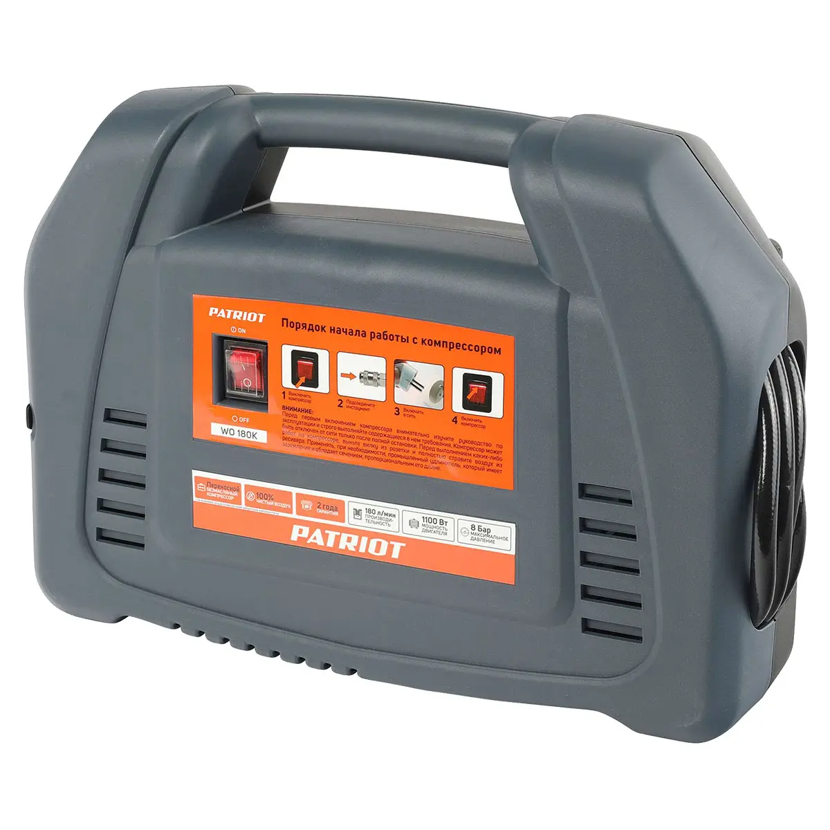 Компрессор поршневой безмасляный Patriot WO 180 K - это надежный и производительный инструмент, который найдет применение в лаборатории, мастерской, дома и на даче. Он работает от электросети 230 В, нагнетает давление до 8 бар со скоростью 180 л/мин и имеет ресивер объемом 6 л. Благодаря этому оборудование может использоваться для распыления лакокрасочных материалов, накачки шин, матрасов, лодок, мячей, продувки фильтров, компьютерной техники, систем отопления и водоснабжения и других работ с применением чистого сжатого воздуха.