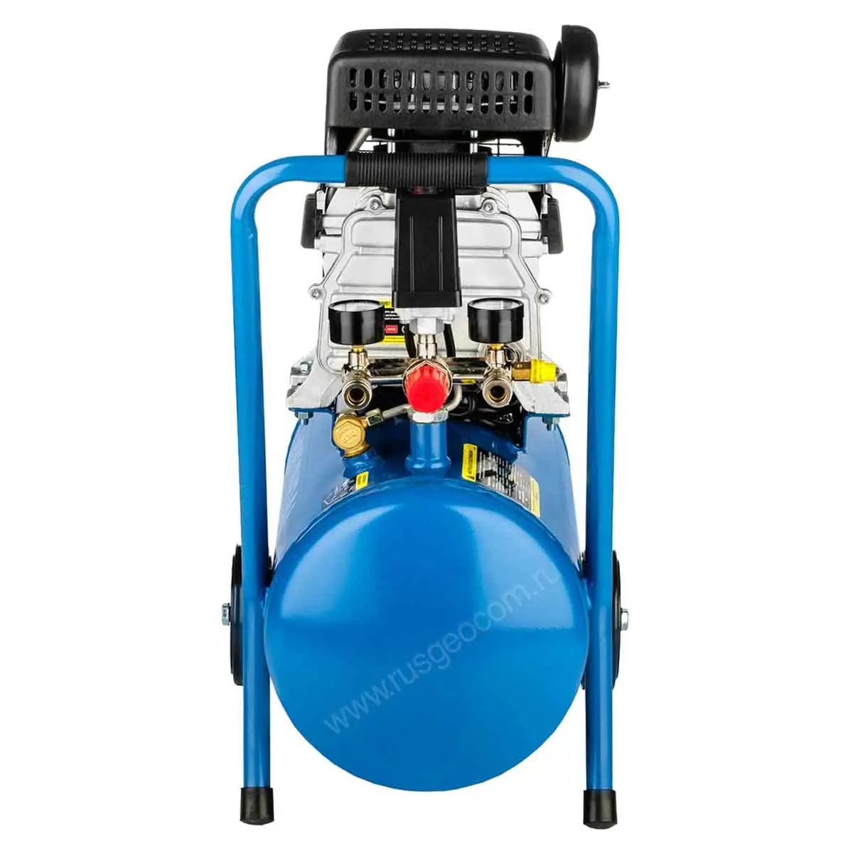 - Компактность – в конструкции используется одноцилиндровый компрессорный блок с прямым приводом от электродвигателя мощностью 1,5 кВт. Оба узла закреплены на 24-литровом ресивере, соосно с ним, за счет чего минимизированы общие габариты конструкции.