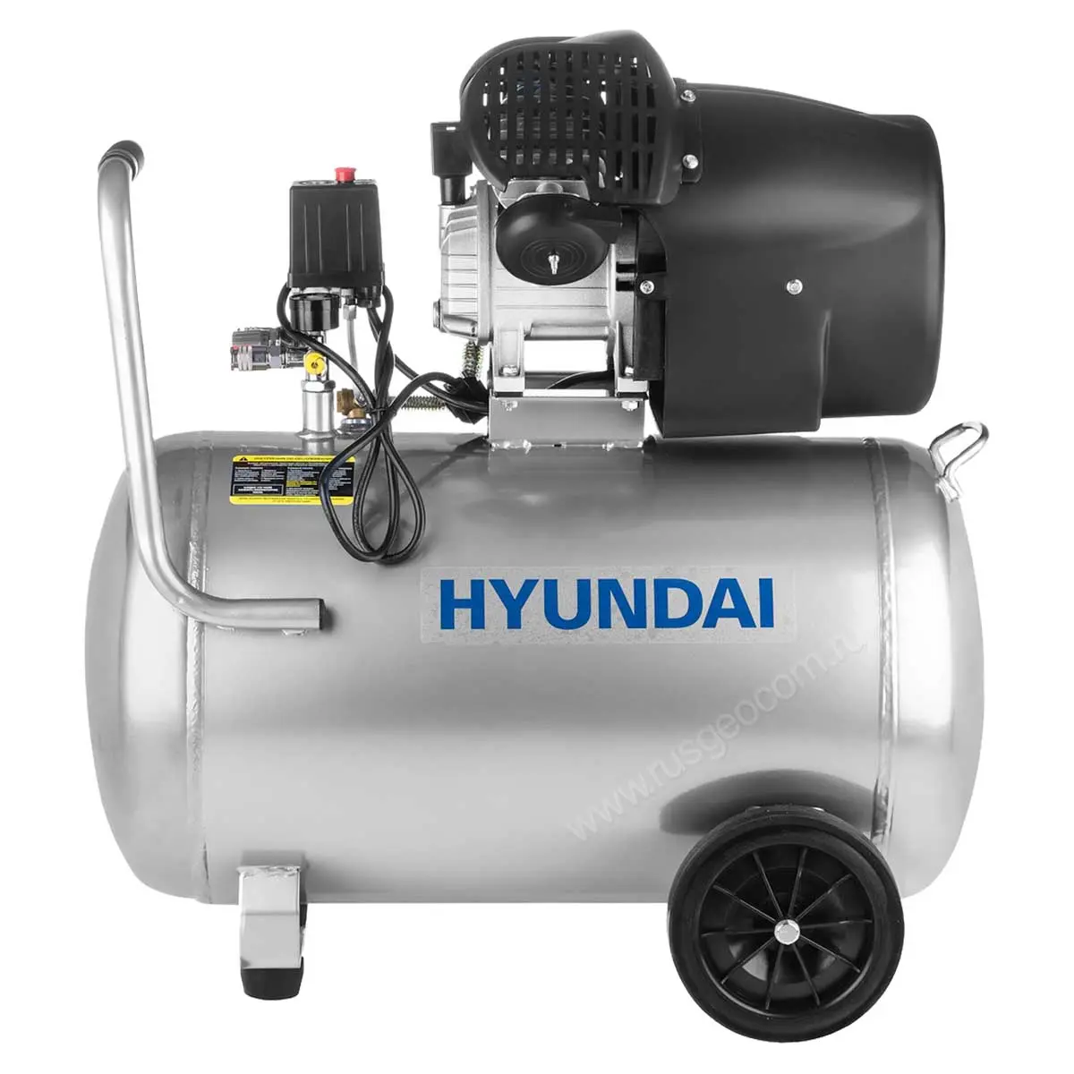 Регулируемое давление на выходе, номинал которого контролируется по показаниям стрелочного манометра, позволяет подключать разнотипное пневматическое оборудование. Наличие одновременно двух выходов дает возможность использовать несколько инструментов, не тратя время на перестыковку магистралей. Для удобного перемещения компрессор Hyundai HYC 402100LMS комплектуется колесной парой с дополнительной опорой и ручкой. С обратной стороны ресивера приварена скоба-рукоятка, упрощающая подъем установки и выполнение погрузочно-разгрузочных операций.