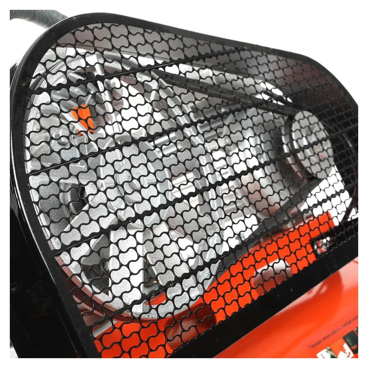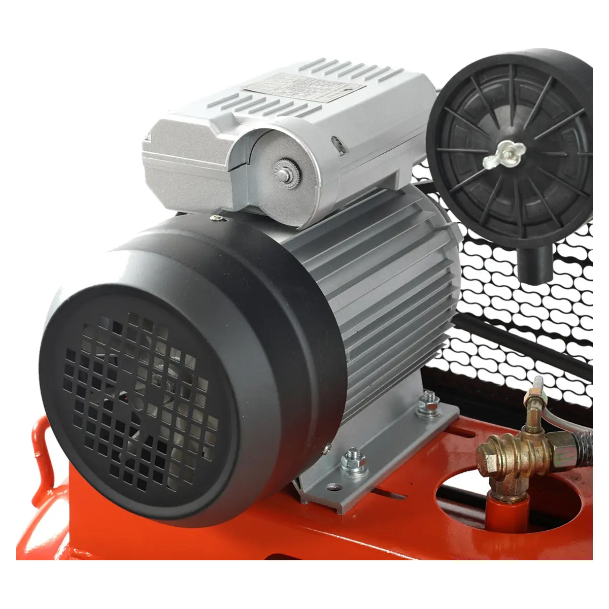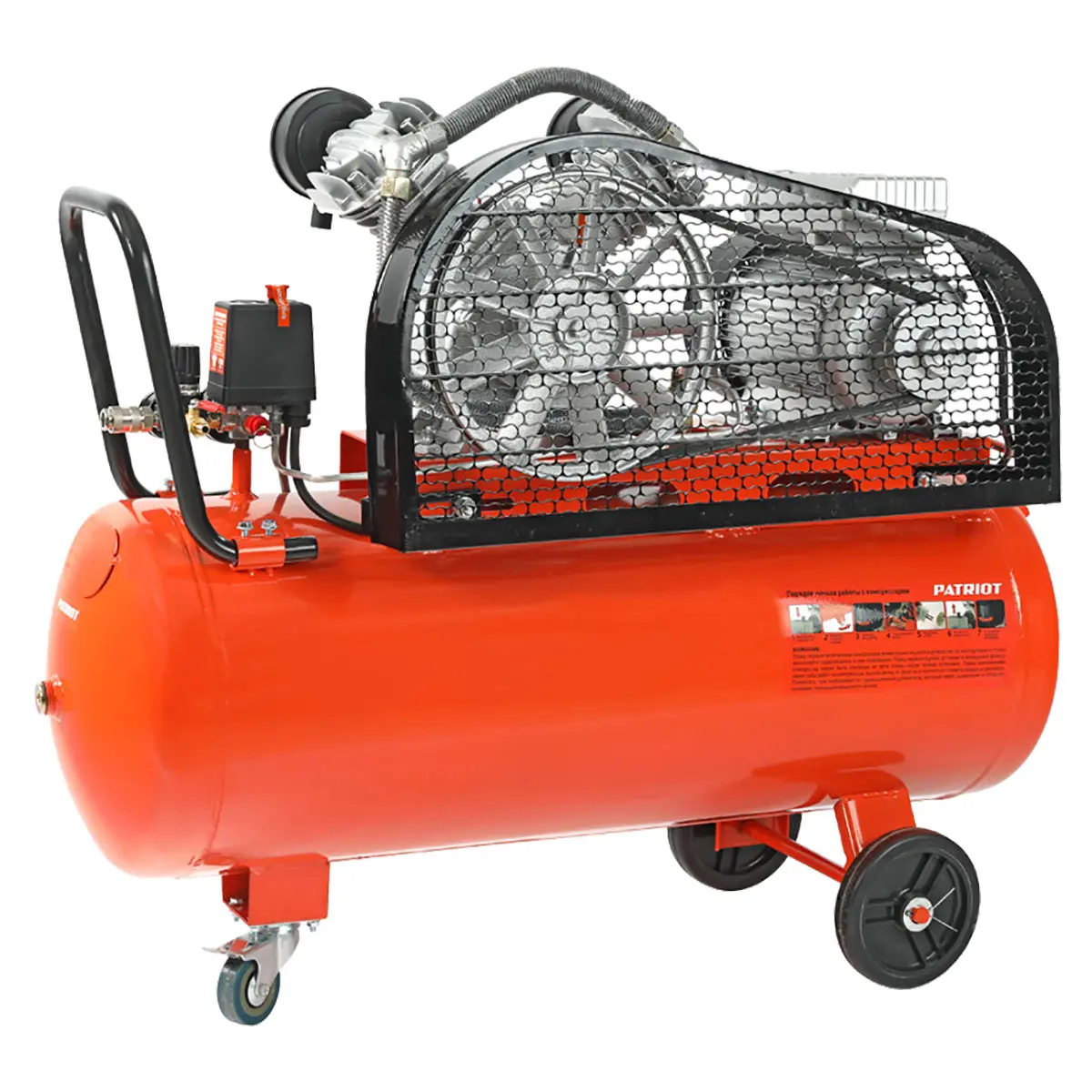 Пневмокомпрессор оснащен прочным металлическим ограждением, которое защищает ременный привод от повреждений и обеспечивает безопасность пользователя. Колеса и рукоятка облегчают перемещение, а поворотное переднее колесо с фиксатором обеспечивает его устойчивое положение во время работы.