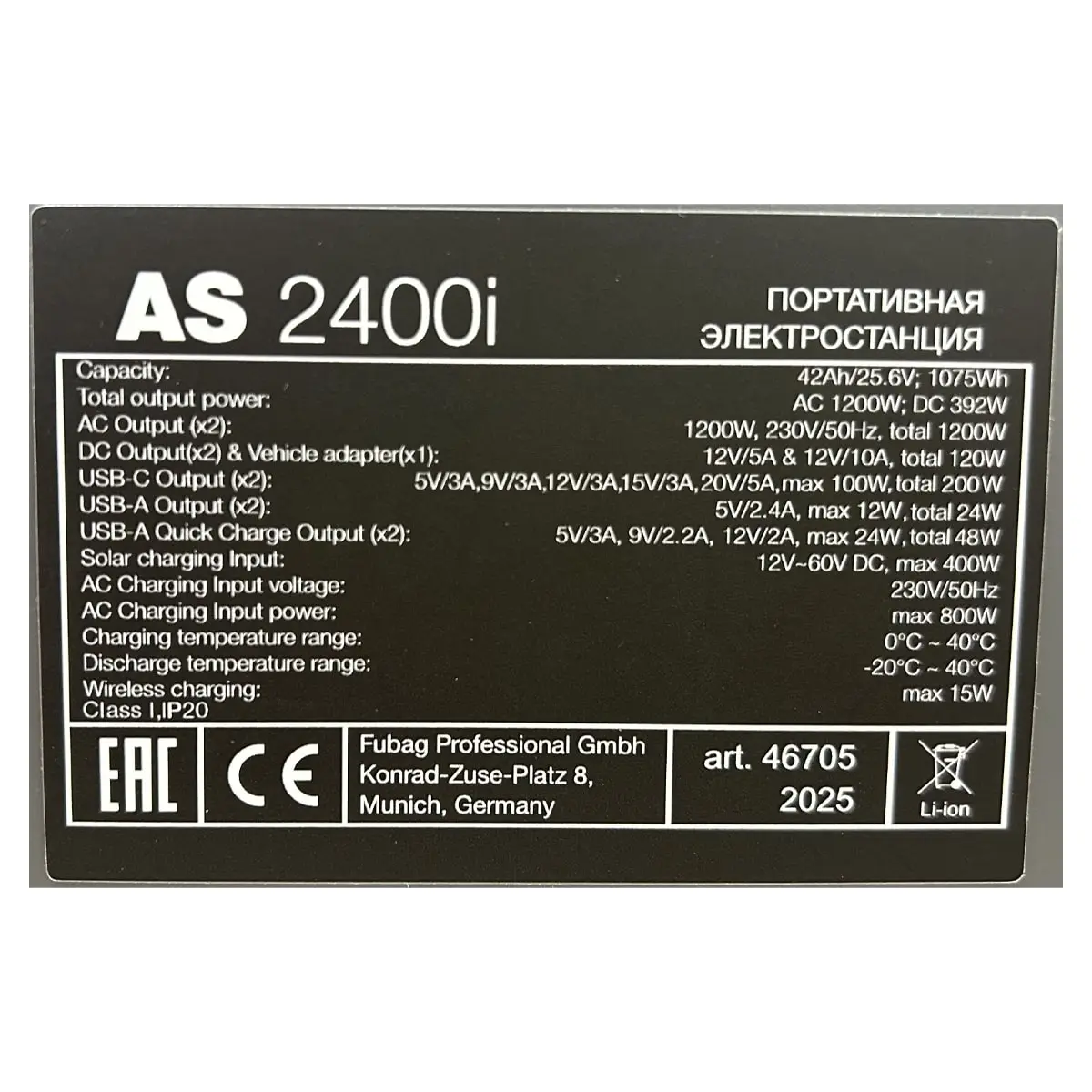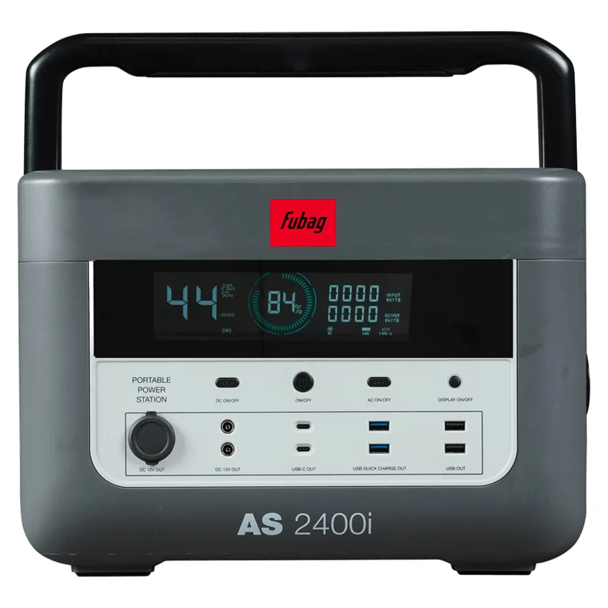 Fubag AS 2400i — это мощная портативная электростанция с пиковой выходной мощностью 2400Вт и номинальной мощностью 1200Вт, которая всегда придет на помощь, если рядом нет электрической сети. Благодаря большому количеству выходных разъемов (USB, USB-C, DC, AC, гнездо для солнечной батареи и автомобильный прикуриватель) она может одновременно заряжать и питать множество устройств: от смартфонов и ноутбуков до камер и колонок, электроинструмента и бытовых приборов.
