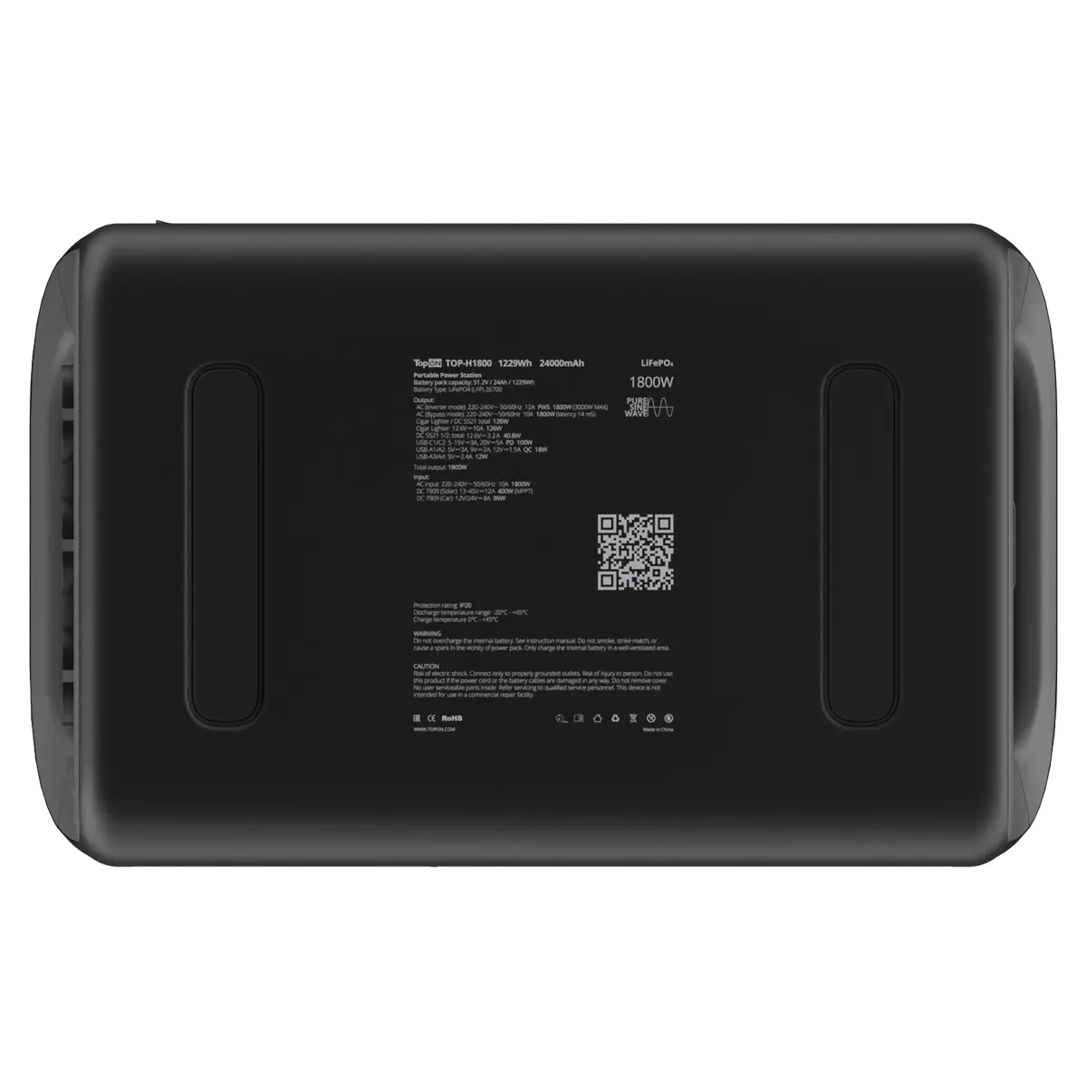 Надежность и долговечность: TOP-H1800 построена на базе литий-железо-фосфатных (LiFePO4) батарей, которые обеспечивают более 4000 циклов зарядки и срок службы свыше 10 лет. Прочный корпус из ABS-пластика с алюминиевым каркасом защищает устройство от повреждений, а интеллектуальная система управления батареей (BMS) предотвращает перегрев, перезаряд и короткие замыкания.