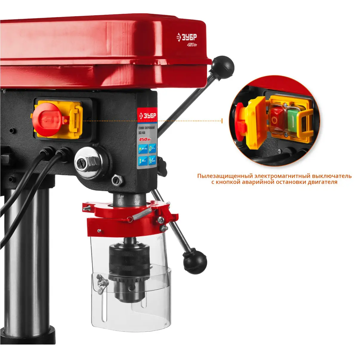 Безопасность оператора - важный аспект работы с любым оборудованием. Этот сверлильный станок оборудован электромагнитным выключателем с кнопкой экстренного выключения для быстрой и безопасной остановки работы.