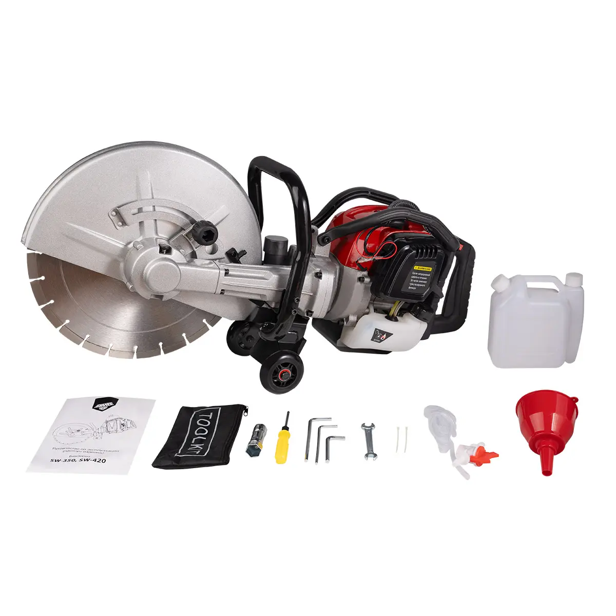 В набор входят все аксессуары, которые требуются для начала работы и обслуживания агрегата, включая алмазный пильный диск по бетону. Комплект инструментов, включающих шестигранники, свечной ключ, отвертку и др., поможет выполнить техобслуживание техники, а канистра для приготовления топливной смеси и воронка значительно упростят процесс дозаправки.