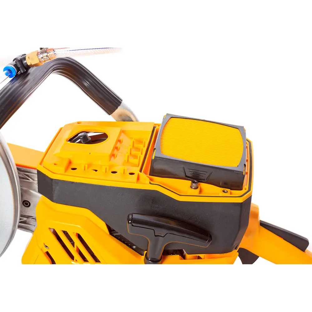 - Универсальность – бензорез может использоваться как с абразивными, так и алмазными высокоскоростными дисками, для работы с последними предусмотрена возможность водяного охлаждения.