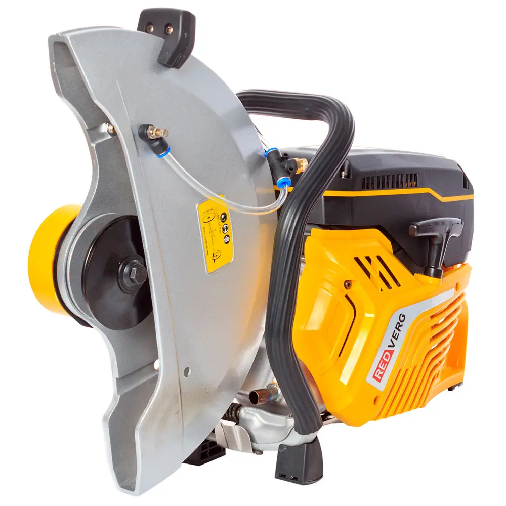 Рассчитанный на выполнение работ в долговременных режимах, с целью обеспечения безопасности персонала бензорез REDVERG RD-GDC400 снабжен защитой от вибраций, которая реализована на основе амортизаторов пружинного типа. Для повышения эксплуатационной безопасности после запуска привода, при его работе на холостых оборотах, режущий диск остается неподвижным. С целью обеспечения правильности установки оснастки на кожухе нанесен указатель направления вращения диска. Для ускорения остановки рабочего элемента после глушения двигателя служит замедлитель трения, что сокращает затраты времени на вспомогательные операции, например, на замену режущего элемента.