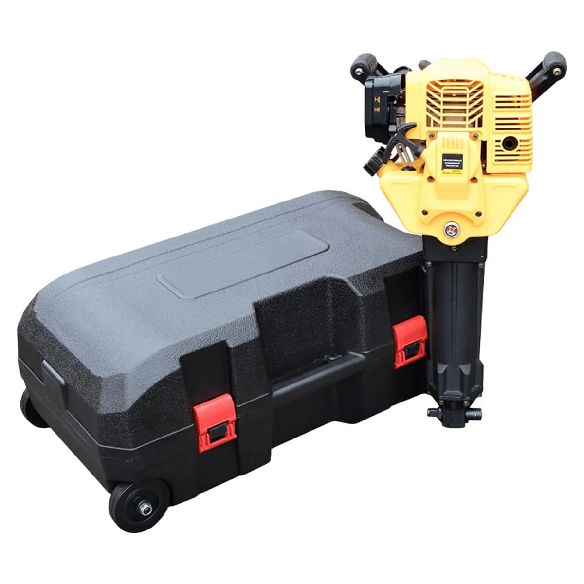 Отбойный молоток TSS-GJH95 в кейсе – ручной инструмент с ударным механизмом на основе пневматического редуктора, который снабжен в качестве привода встроенным бензиновым двигателем с ручным стартером. Изделие подходит для использования в строительных отраслях при выполнении ремонтных, дорожных и земляных работ, для аварийно-спасательных операций, обеспечивая разрыхление, скалывание и дробление грунтов, проведение демонтажа с разрушением бетонных конструкций, асфальтовых и прочих покрытий, кирпичной и каменной кладки и т.п. Также с его помощью можно производить подбивку шпал, выполнять ударное погружение свай, стержней заземления и пр.