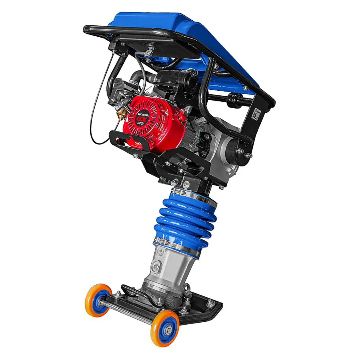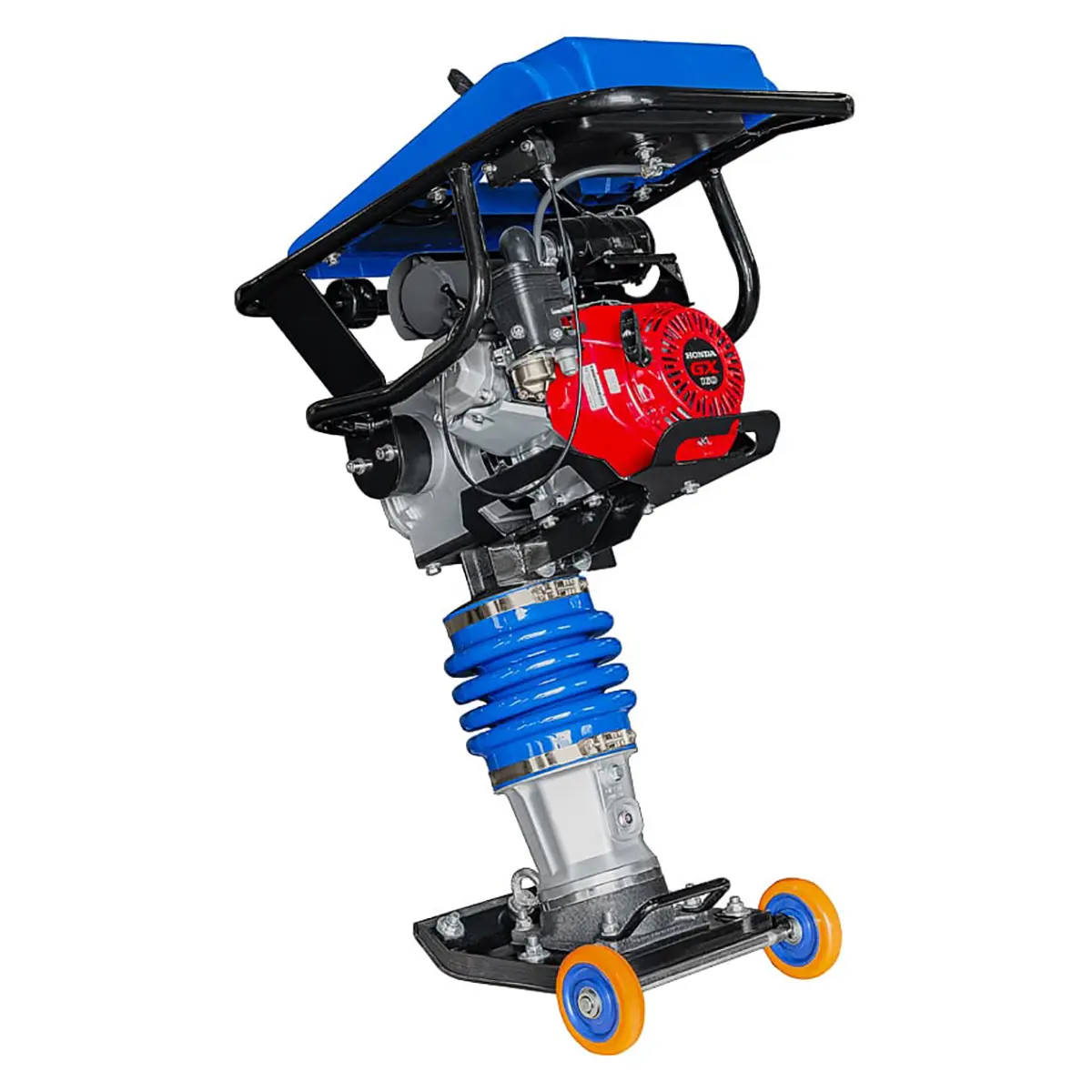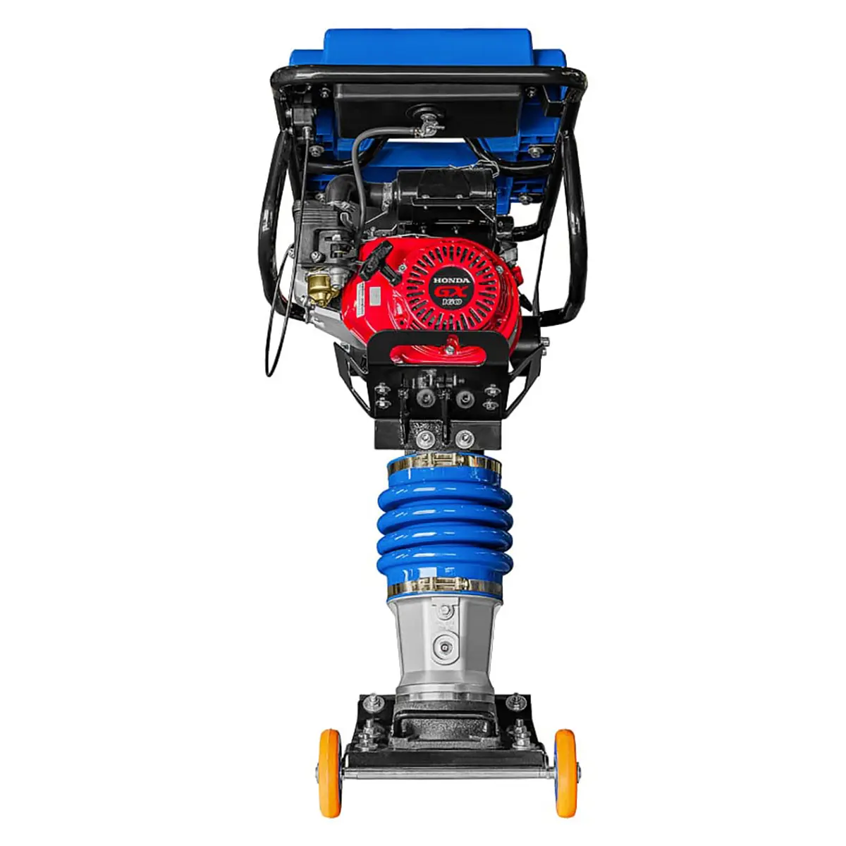 Прочная металлическая рама вибротрамбовки эргономична и надежна, что позволяет крепко удерживать инструмент в руках.
