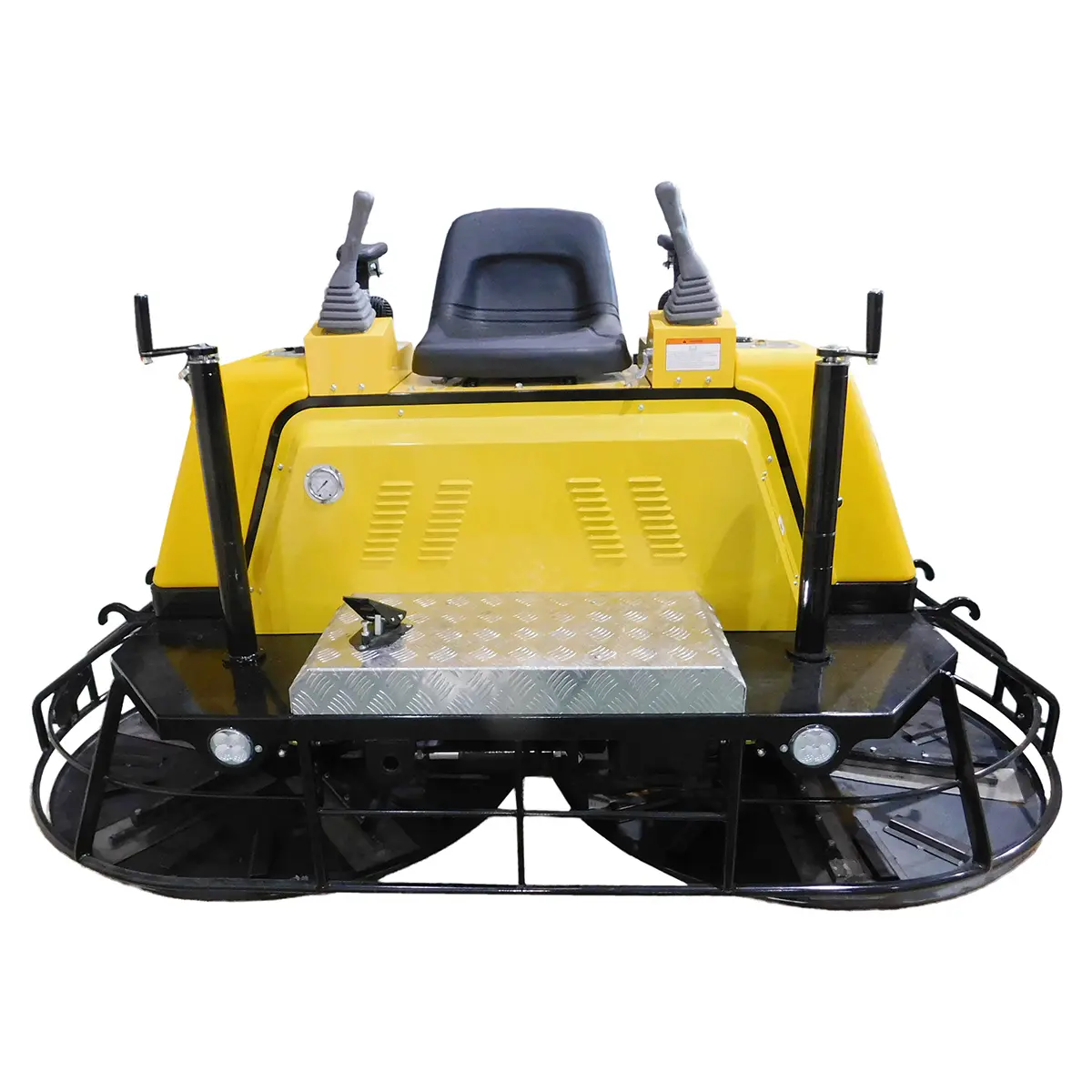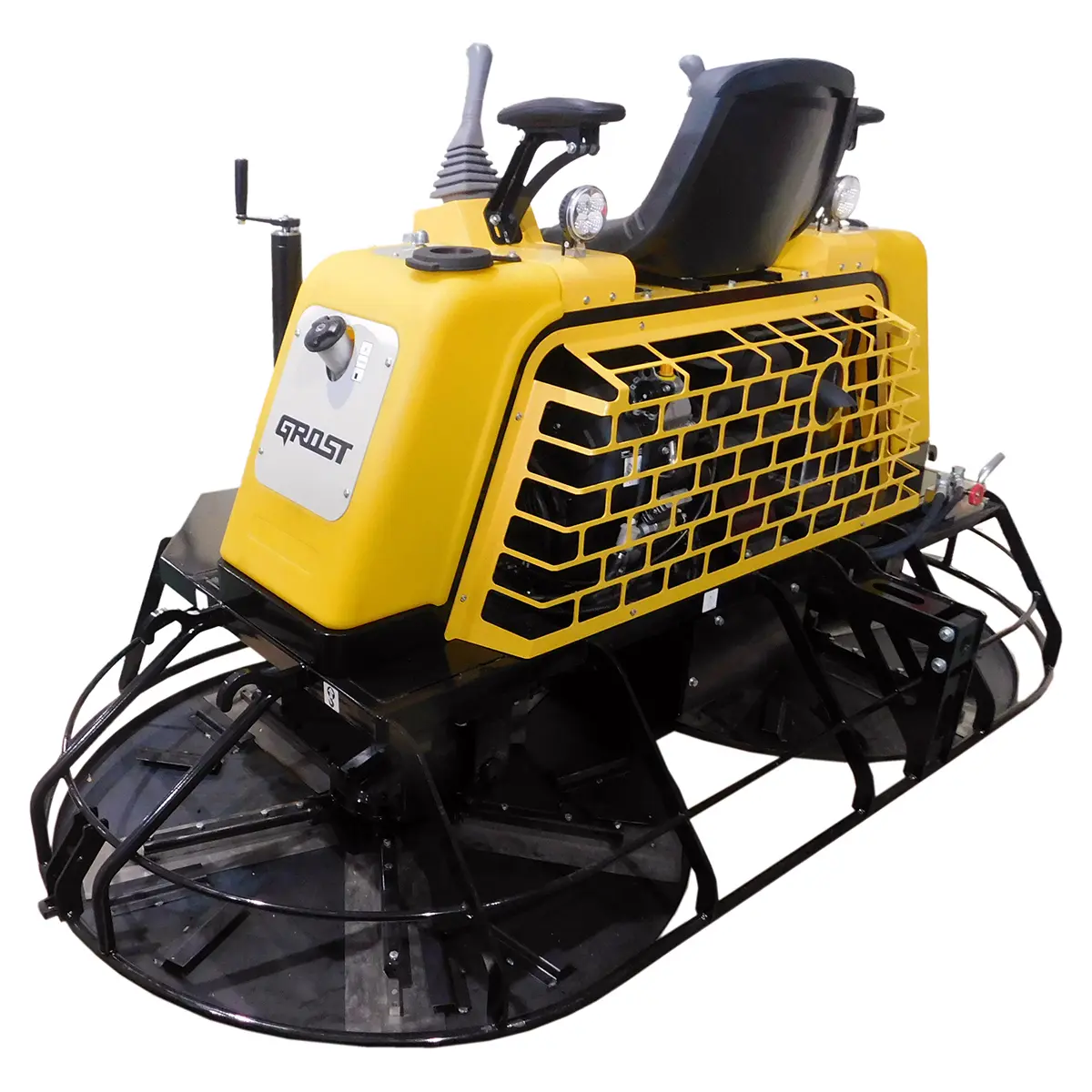 Высокопроизводительная двухроторная затирочная машина GROST ZMD1200H управляется сидящим на ней оператором. Машина укомплектована мощным бензиновым двигателем мощностью 35 л.с (3600 об/мин) с электрозапуском. Емкость топливного бака 23 л, расход топлива 296г/кВт*ч.