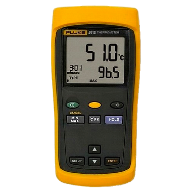 Fluke 51 II служит для контактного измерений температуры материалов различных видов. Данное устройство применяют во время исследований в лабораториях, оно будет полезно и для определения температуры в промышленных печах. Пределы измерений аппарата зависят от типа используемой термопары. Аппарат совместим с термопарами K, E, T, и J-типов. Прибор обладает высокой достоверностью измерений: его погрешность лежит в диапазоне 0,05 до 0,3% в зависимости от типа детектора.