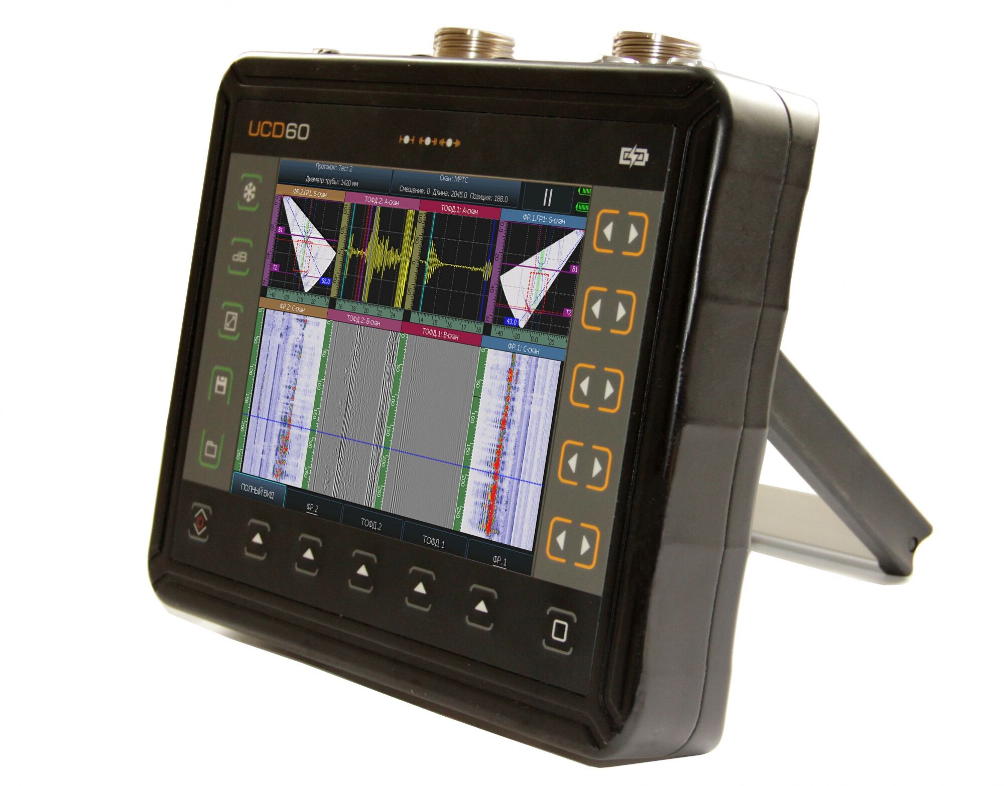 Одновременно также можно использовать до 2х каналов TOFD, что позволяет проводить контроль, соответствующий всем современным мировым стандартам. Так же в приборе реализована функция обычного классического дефектоскопа.