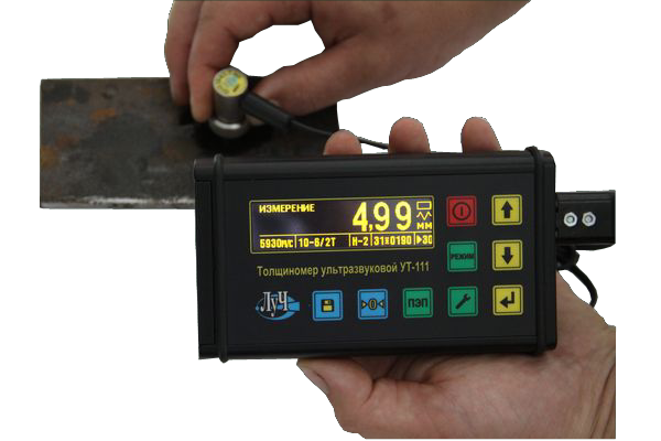 Толщиномер ультразвуковой УТ-111 общего назначения по ГОСТ 28702-90, предназначен для ручного контактного измерения толщины изделий из различных металлов и сплавов, стекла, керамики, полимерных и композиционных материалов, у которых коэффициент затухания ультразвуковых колебаний на частоте 5,0 МГц не превышает 0,3 дБ/см, со скоростями распространения продольных ультразвуковых колебаний (УЗК) от 100 до 9999 м/с при одностороннем доступе к объекту измерения.