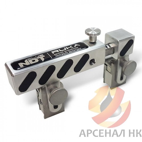RUKA ручное устройство контроля арматуры - предназначено для ручного ультразвукового контроля стыковых однорядных соединений стержней арматуры диаметром от 20 до 40 мм выполненных ванными и многослойными способами сварки в инвентарных формах, на стальных скобах-накладках и подкладках или без формующих и вспомогательных элементов. Устройство применяется в составе с ультразвуковым высокочастотным дефектоскопом общего назначения, позволяющим работать по раздельной схеме подключения ультразвуковых пьезоэлектрических преобразователей (ПЭП).