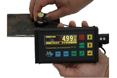 Толщиномер ультразвуковой УТ-111 общего назначения по ГОСТ 28702-90, предназначен для ручного контактного измерения толщины изделий из различных металлов и сплавов, стекла, керамики, полимерных и композиционных материалов, у которых коэффициент затухания ультразвуковых колебаний на частоте 5,0 МГц не превышает 0,3 дБ/см, со скоростями распространения продольных ультразвуковых колебаний (УЗК) от 100 до 9999 м/с при одностороннем доступе к объекту измерения.