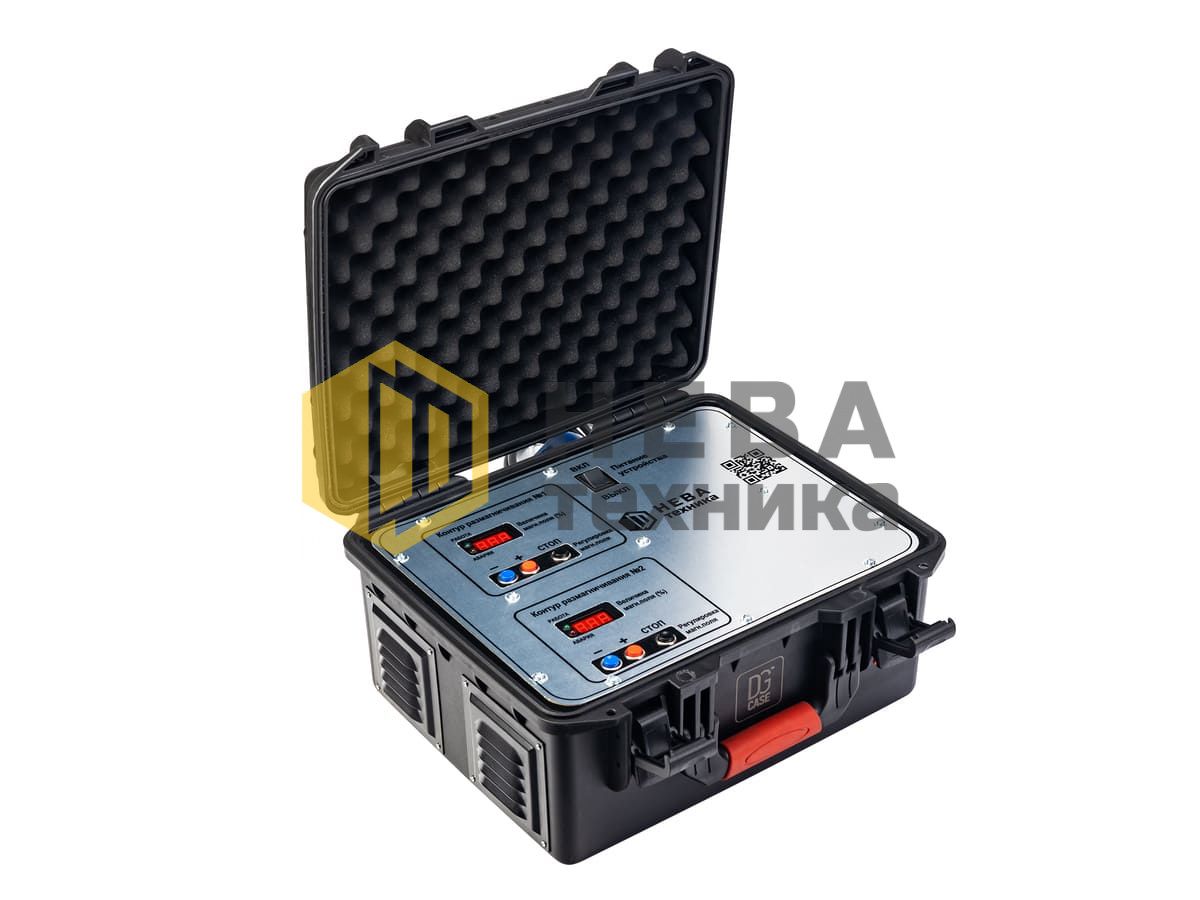 Устройство выполнено в ударопрочном кейсе для надежного хранения и транспортировки силового блока. Каждый канал имеет свою систему управления с дистанционным проводным пультом, универсальную размагничивающую обмотку и соединительный кабель обмотки. Для контроля намагниченности используется индикатор магнитного поля (2 шт), входящие в комплект поставки. Обмотка рассчитана на гарантированное размагничивание труб диаметром 1420 мм.