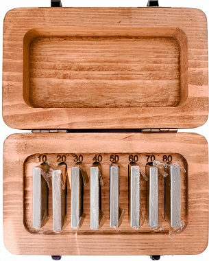 Комплект образцов шероховатости ОШС-ШП АЛЬФА-НДТ представляет собой набор из 8 пластин, полученных плоским шлифованием с различными номинальными значениями параметра Rz: Rz10; Rz 20; Rz 30; Rz 40; Rz 50; Rz 60; Rz 70; Rz 80.Форма образцов - плоская, материал образцов - сталь.