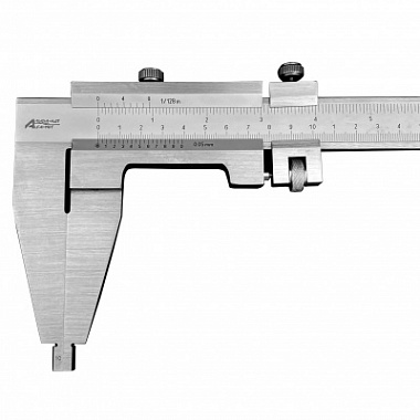 Штангенциркуль имеет две шкалы и микровинтовое устройство для тонкой регулировки рамки. Основная шкала нанесена на штанге с делениями через 1 мм, вторая шкала с ценой деления 0.05 мм расположена на нониусе, который закреплен на рамке. Фиксация рамки производится при помощи стопорного винта.