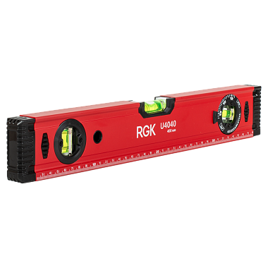 Строительный уровень RGK U4040 длиной 40 сантиметров оснащен магнитом для крепления на металлических поверхностях, чтобы освободить руки при проведении разметки. Поворотная ампула поможет контролировать наклонные поверхности под углом от 0° до 90°.
