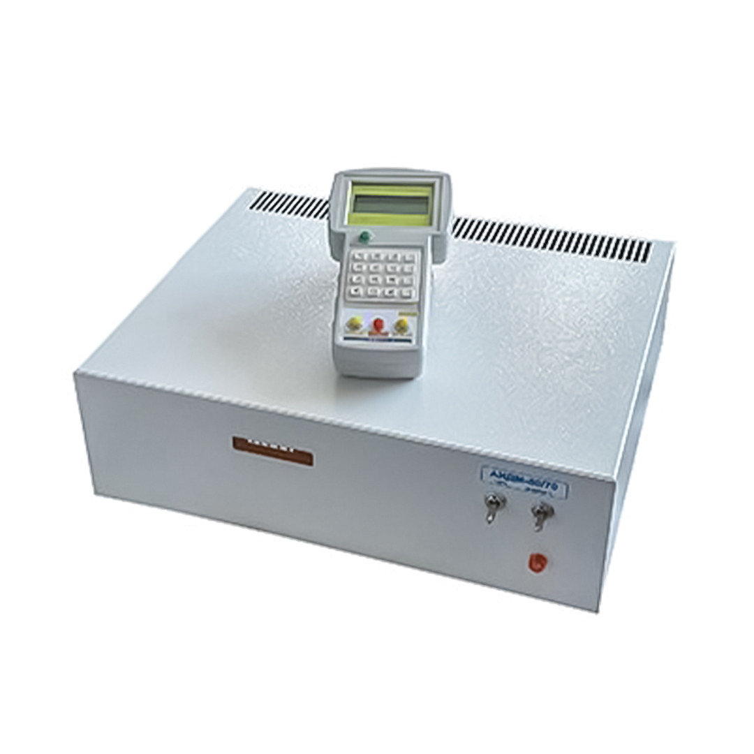 Установка состоит из блока управления и дистанционного пульта на ИК-лучах с жидкокристаллическим дисплеем, на котором отображается вся необходимая информация, в том числе: названия программ, значения напряжений и токов в цифровой форме, результаты испытаний и т.д.