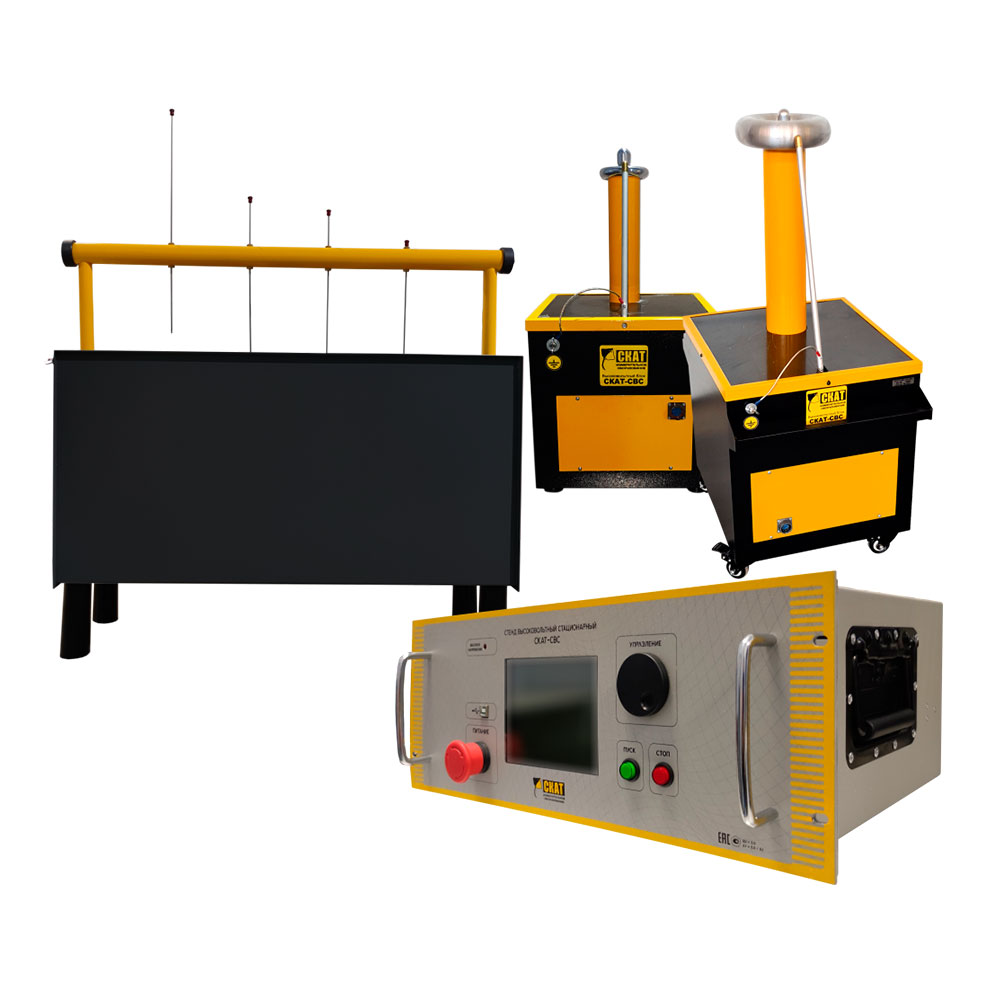 СКАТ-СВС предназначен для проведения приёмосдаточных и эксплуатационных электрических испытаний средств защиты (изоляционные штанги, резиновые боты, перчатки, электроинструмент и т.п.) переменным напряжением промышленной частоты, регулируемым в пределах от 0 до 100 кВ. Также оборудование стендов может использоваться для испытаний изоляции переменным током (кабелей, изоляторов).