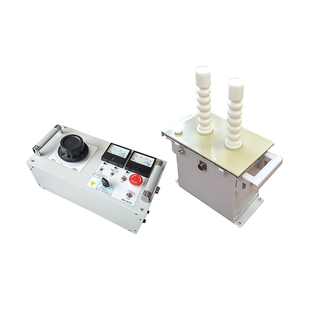 Высоковольтная испытательная установка УВУ-50/70Л состоит из двух блоков — высоковольтного и блока управления и имеет два режима работы: «ТЕСТ» и «ПРОЖИГ». Разъем для подключения наружного конечного выключателя и «0»